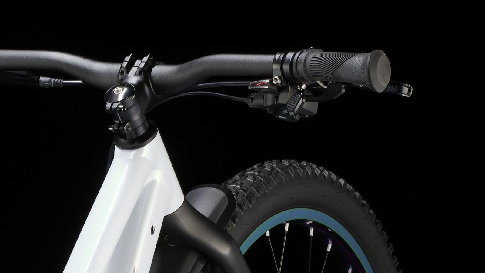 Einen Rahmen aus Alpha Silver Aluminium mit 24 Zoll gro�en Laufr�dern und griffigen, 2,4 Zoll breiten Stollenreifen, die sich im Untergrund festbei�en und ein Plus an Traktion bieten. Dazu gibt es eine speziell auf Kinderbed�rfnisse zugeschnittene Ausstattung, wie etwa die intuitive 9-Gang-Schaltung von microSHIFT und die kraftvoll zupackenden hydraulischen Scheibenbremsen.