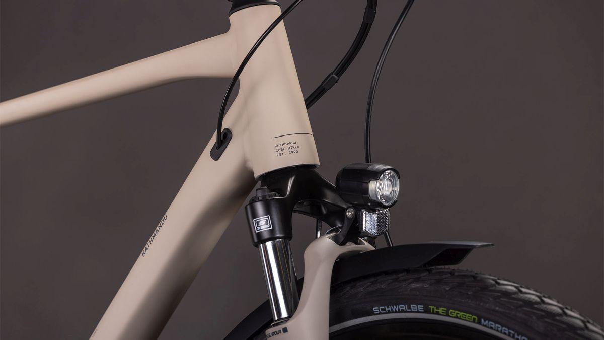 Aufsitzen, antreten und die Tour genießen: Mit dem schlichten Kathmandu ONE von CUBE bekommen Entdecker einen robusten und flexibel anpassbaren Alleskönner unter den Sattel. Auf dem stabilen, vielseitigen integrierten Gepäckträger IC 3.0 findet alles Platz, was unterwegs mit muss. ACID Schutzbleche, Vorder- und Rücklichter und ein Flat Mount Seitenständer sind auch mit dabei. Dazu hat die einfach bedienbare Cues 2x9-fach Schaltung aus dem Hause Shimano in jeder Situation den passenden Gang im Angebot. Ebenso von Shimano kommen die hydraulischen Scheibenbremsen für sicheres Verzögern und Anhalten bei jedem Wetter. Angenehmer Fahrkomfort, auch auf holprigen Wegen, ist das Spezialgebiet der Suntour Federgabel. Umweltbonus: Die spezielle Gummimischung der Green Marathon Reifen von Schwalbe besteht zum Großteil aus recycelten Altreifen – für nachhaltige Mobilität auf allen Wegen. Da kann's doch direkt losgehen, oder?
