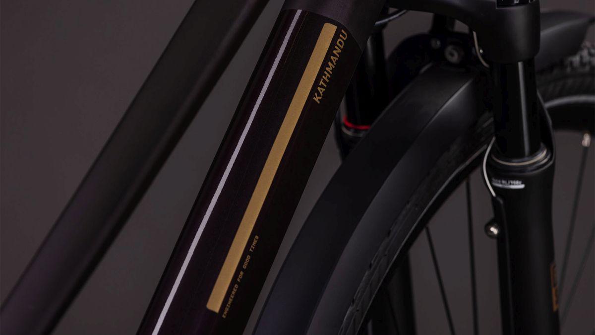 Der Trapezrahmen des Kathmandu aus dem Hause CUBE ist ein Sinnbild für klassische Eleganz! Der integrierte Gepäckträger IC 3.0 geht nahtlos und formschön in unsere ACID Schutzbleche über. Dazu gibt's am Hinterrad Aufnahmen für eine Flat Mount Scheibenbremse und einen Seitenständer. Seine cleane, aufgeräumte Optik verdankt das Chassis den im Smooth Welding Verfahren gestalteten Rohrverbindungen und im Unterrohr verlaufenden Zügen. So viel zum Aussehen. In Sachen Funktion haben wir den Hinterbau mit einer Steckachse versehen und ein konisches Steuerrohr für optimierte Stabilität und Lenkpräzision (selbst bei voller Beladung) verbaut. Also alles da, was es auf Tour braucht – den Rest machst du!