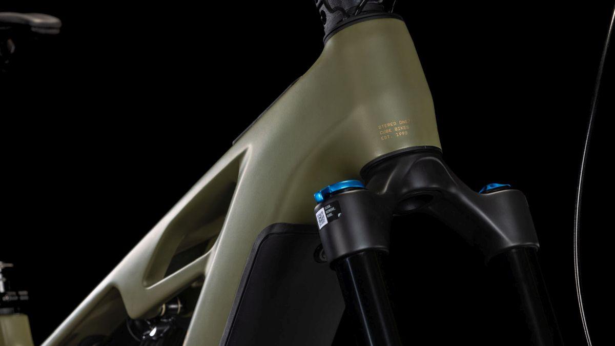 Der Rahmen des Stereo Hybrid ONE77 HPC ist wahrlich eine Klasse für sich, denn hier treffen 170 mm Federweg an der Front und am Heck auf ein Mullet-Set-up mit einem 29 Zoll Vorderrad und 27.5 Zoll Hinterrad. Damit werden Big-Mountain-Trail-Träume wahr! Wie immer bei CUBE maximal detailverliebt konstruiert auch der Rest: Integrated Cable Routing sorgt für einen supercleanen Look und reduziert den Wartungsaufwand auf ein Minimum. Dazu kommt ein Steuersatz zur Winkelverstellung, mit dem sich das Handling an individuelle Vorlieben und Anforderungen anpassen lässt. Außerdem haben wir den 800 Wh starken PowerTube Akku gleich über dem Bosch CX Motor sauber und formschön ins Carbon-Unterrohr integriert. Für einfachere Ersatzteilverfügbarkeit gibt's ein UDH am Aluminium-Hinterbau – und weil wir auch eine Direct Mount Kettenführung verbaut haben, geht's mit diesem Fully selbst bei schwierigen Bedingungen weiter, weiter und immer weiter.