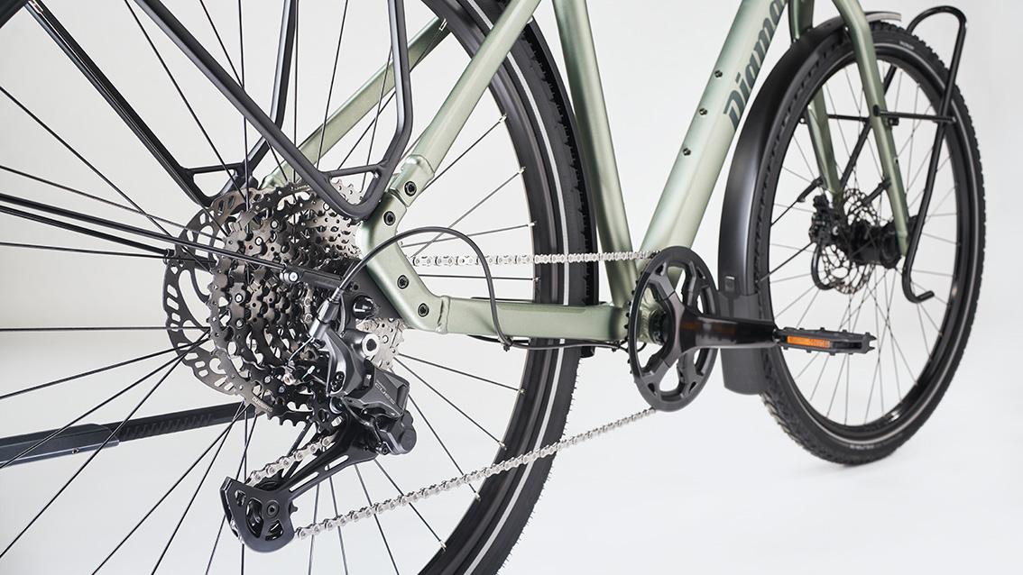 Den modernen 1fach-Antrieb mit nur einem Kettenblatt an der Kurbel schaltest du einhändig - wie bei einer Nabenschaltung, aber mit Hebeln statt Drehgriff. Bei Diamant ist die Übersetzung optimal auf City/Trekking® abgestimmt. Das Ergebnis ist intuitiv, praktisch, verschleißarm und leichter als jede Alternative.