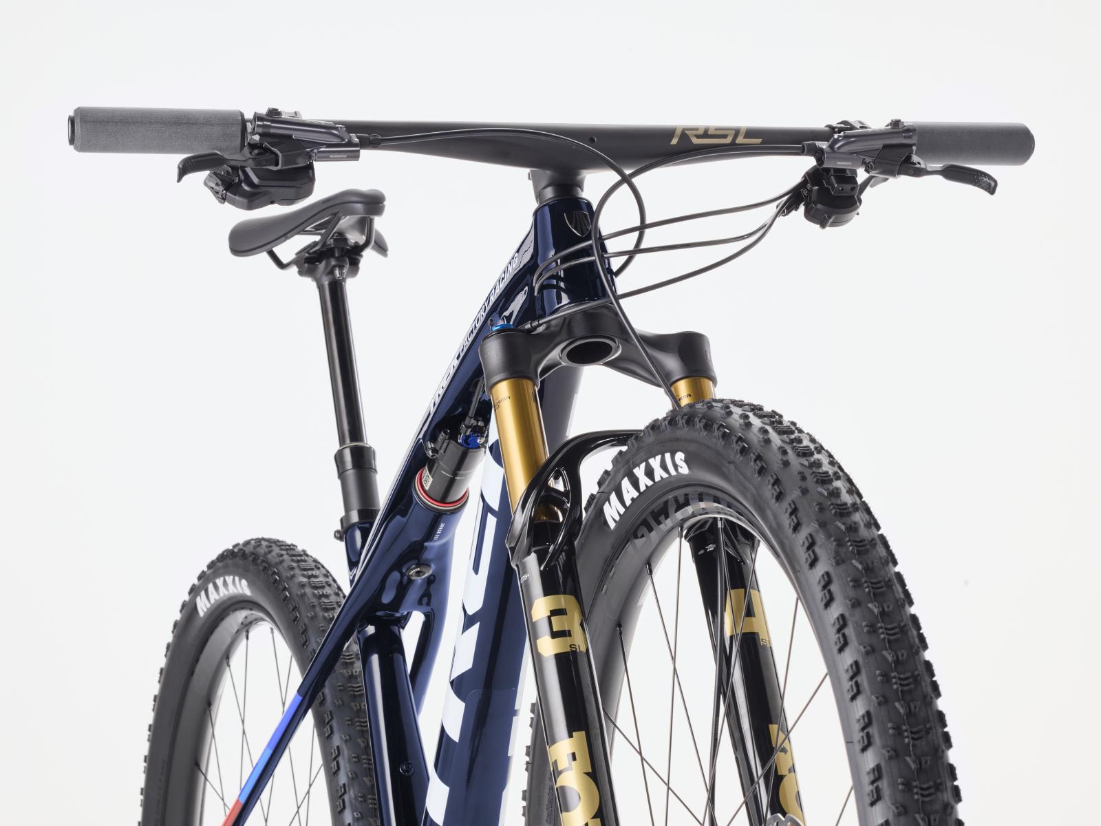 Einen federleichten Rahmen aus hochmoduligem SLR OCLV Mountain Carbon mit moderner XC-Geometrie. Dazu gibts eine FOX Factory 34 SL Step-Cast 110-mm-Federgabel mit Float EVOL Luftfederung, GRIP SL 2-Positionen-Dämpfung und Dual-Remote-Lockout und einen RockShox SIDLuxe IsoStrut-Dämpfer mit 80 mm Federweg. Shimanos brandneuer drahtloser XT Di2 12fach-Antrieb, Bontrager Kovee Elite 30 Carbonlaufräder, eine integrierte Bontrager RSL Lenker/Vorbau-Einheit aus Carbon, eine Bontrager Line Variosattelstütze und hydraulische Shimano XT M8200 Scheibenbremsen runden das Ausstattungspaket ab.
