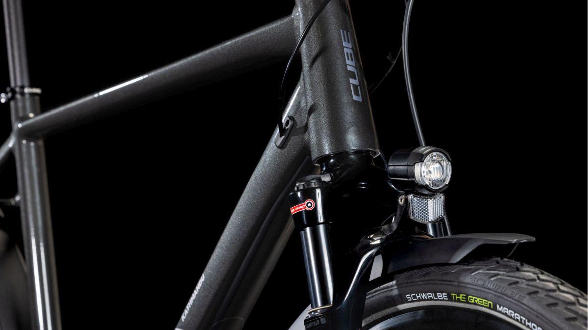 Das Kathmandu Pro hat alles, was wichtig ist, und kommt ohne unnötigen Schnickschnack aus. Seine schlichte Eleganz und hohe Alltagstauglichkeit verdankt es dem integrierten Gepäckträger, dazu haben wir Schutzbleche, Vorder- und Rücklichter und den CUBE FM Seitenständer montiert. Das Bike stellt dank seiner robusten Konstruktion aber auch auf langen Strecken seine Qualität unter Beweis – komfortabel dabei: die Suntour Luftfedergabel, die sämtliche Buckel oder Schlaglöcher auf der Strecke glattbügelt. Die Reifen von Schwalbe bestehen aus recyceltem Kautschuk, was die Umwelt schont. Shimano steuert seine breit gefächerte Cues 2x10-Gang Schaltung bei – so wird jede Route zum Spaziergang. Dazu passende hydraulische Shimano Scheibenbremsen ermöglichen sichere Bremsmanöver, selbst bei Nässe und voller Beladung. Ob Großstadtdschungel oder Outback: Das Kathmandu Pro ist live dabei!