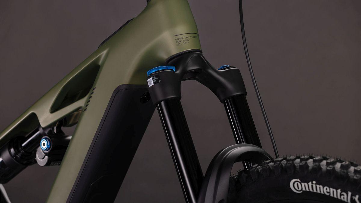 Der Rahmen des Stereo Hybrid ONE77 HPC ist wahrlich eine Klasse für sich, denn hier treffen 170 mm Federweg an der Front und am Heck auf ein Mullet-Set-up mit einem 29 Zoll Vorderrad und 27.5 Zoll Hinterrad. Damit werden Big-Mountain-Trail-Träume wahr! Wie immer bei CUBE maximal detailverliebt konstruiert auch der Rest: Integrated Cable Routing sorgt für einen supercleanen Look. Dazu kommt ein Steuersatz zur Winkelverstellung, mit dem sich das Handling an individuelle Vorlieben und Anforderungen anpassen lässt. Außerdem haben wir den 800 Wh starken PowerTube Akku gleich über dem Bosch CX Motor sauber und formschön ins Carbon-Unterrohr integriert. Für einfachere Ersatzteilverfügbarkeit gibt's ein UDH am Aluminium-Hinterbau – und weil wir auch eine Direct Mount Kettenführung verbaut haben, geht's mit diesem Fully selbst bei schwierigen Bedingungen weiter, weiter und immer weiter.