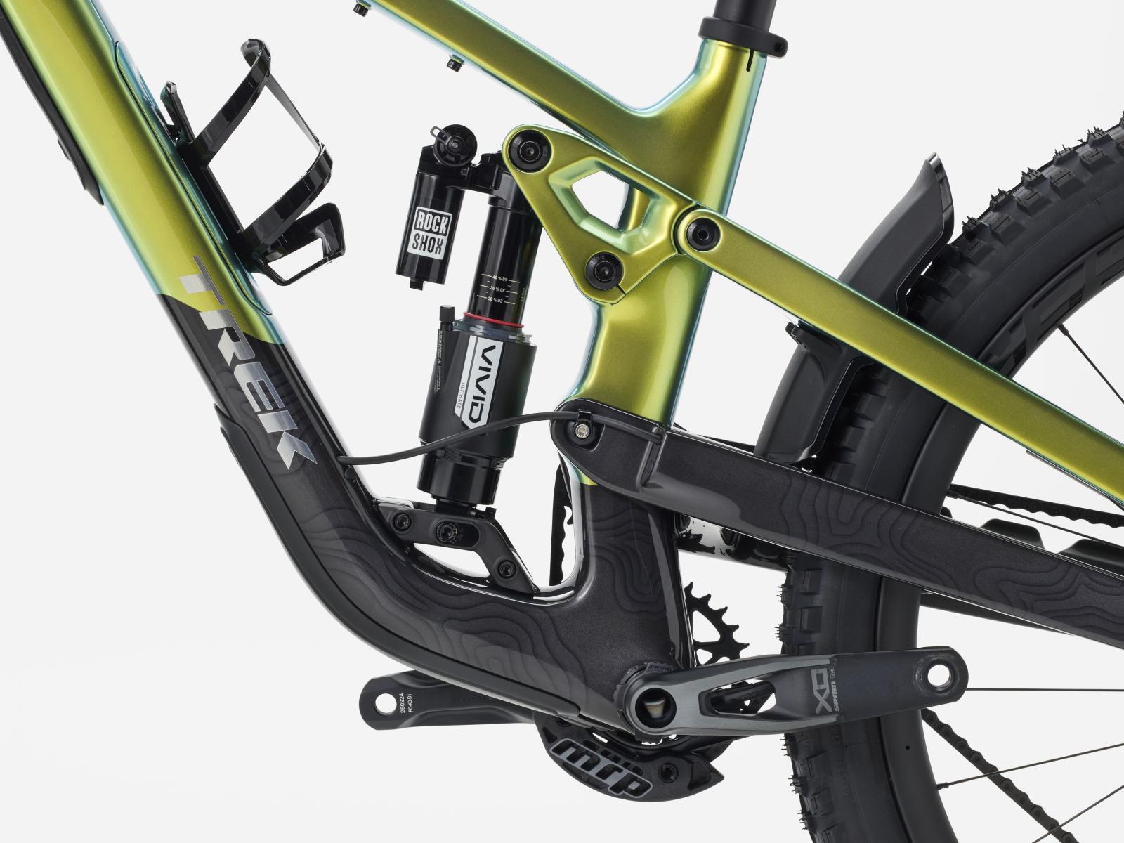 Einen Rahmen aus OCLV Mountain Carbon mit High-Pivot-Fahrwerk und Rahmenstaufach, 170 mm vorderem und hinterem Federweg dank RockShox ZEB Ultimate Gabel mit DebonAir Federung und Charger 3.1 RC2 Dämpfung sowie RockShox Vivid Ultimate Hinterbaudämpfer. Die drahtlose SRAM X0 Eagle AXS Transmission schaltet selbst unter Last knackig und präzise, während eine drahtlose RockShox Reverb AXS Variosattelstütze deine Bewegungsfreiheit auf dem Bike ungemein erhöht. Die Bontrager Line Pro 30 Tubeless-Ready-Carbonlaufräder (29" vorn, 27,5" hinten) samt Rapid Drive Naben machen das Bike bereit für vielseitiges Terrain.
