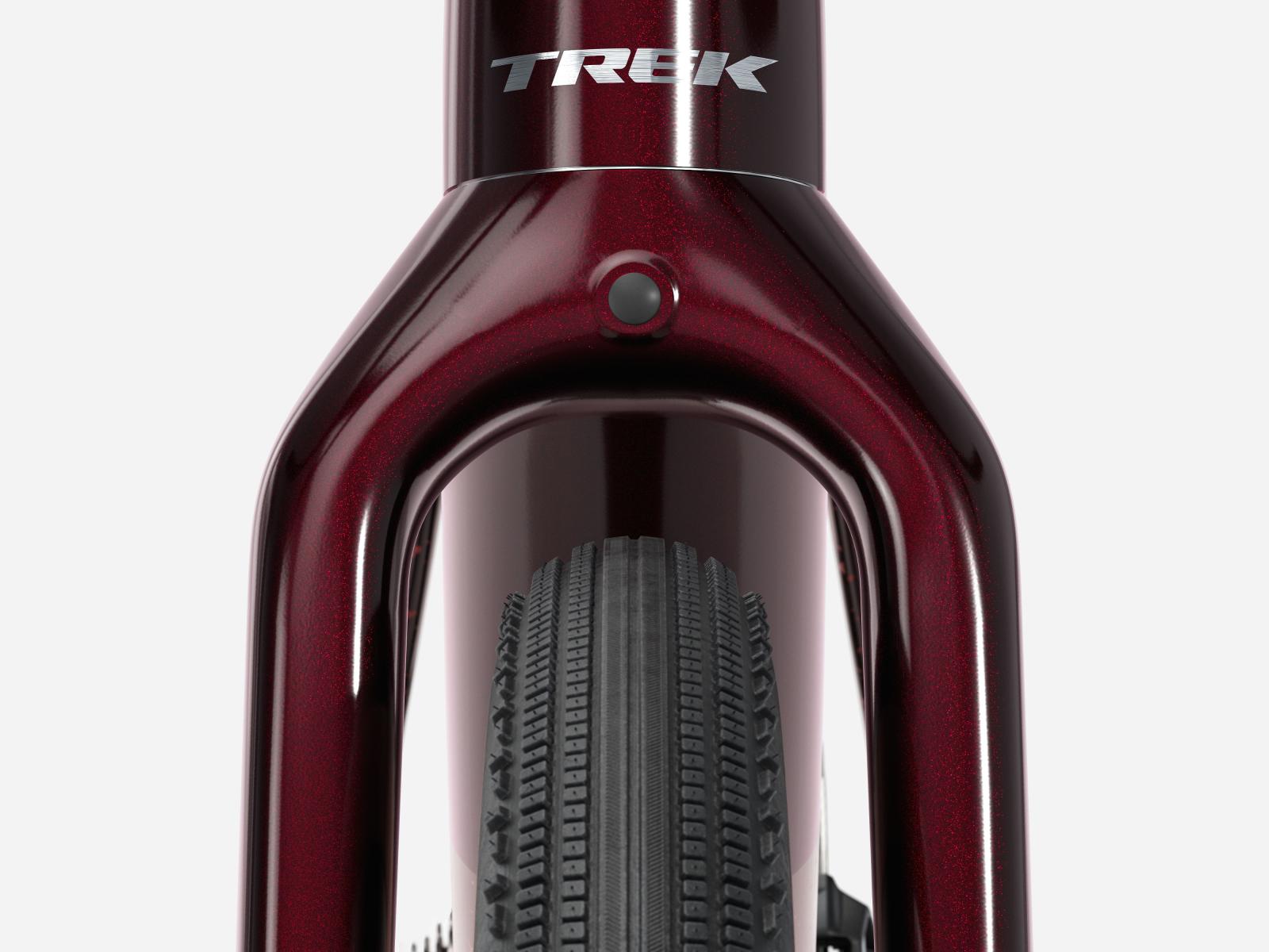 Einen Rahmen aus 500 Series OCLV Carbon samt Carbongabel, Staufach im Unterrohr und Platz für Reifen bis 50 mm (wie gemessen) sowie Befestigungsmöglichkeiten an Rahmen und Gabel. Eine komplett drahtlose SRAM Force XPLR AXS E1 1x13-Schaltung, hydraulische Scheibenbremsen, eine Carbonsattelstütze und Bontrager Aeolus Elite 35V Tubeless-Ready-Laufräder mit 42 mm breiten Reifen.