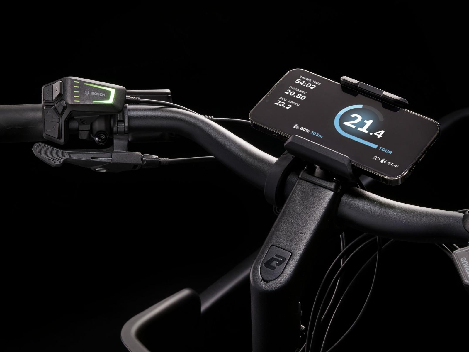 Bosch SmartphoneGrip lädt dein Smartphone beim Fahren auf und verwandelt es in ein praktisches Display zur Anzeige wichtiger Fahrdaten.