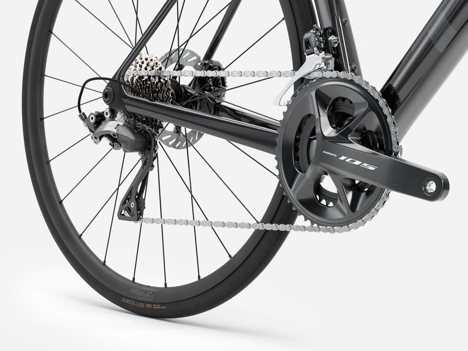 Das Madone SL 5 Gen 8 ist ein leichtes Aero-Rennrad, das Elite-Renntechnologie erschwinglich macht. Es bietet ähnliche aerodynamische Vorteile wie das höherpreisige Madone SLR Gen 8, basiert aber auf einem erschwinglicheren Layup aus 500 Series OCLV Carbon und einem zweiteiligen Cockpit mit interner Zugführung. Die zuverlässige und präzise Shimano 105 Gruppe sowie der Lenker und die Laufräder aus Aluminium halten den Preis im überschaubaren Rahmen und überzeugen mit einer großartigen Performance.
