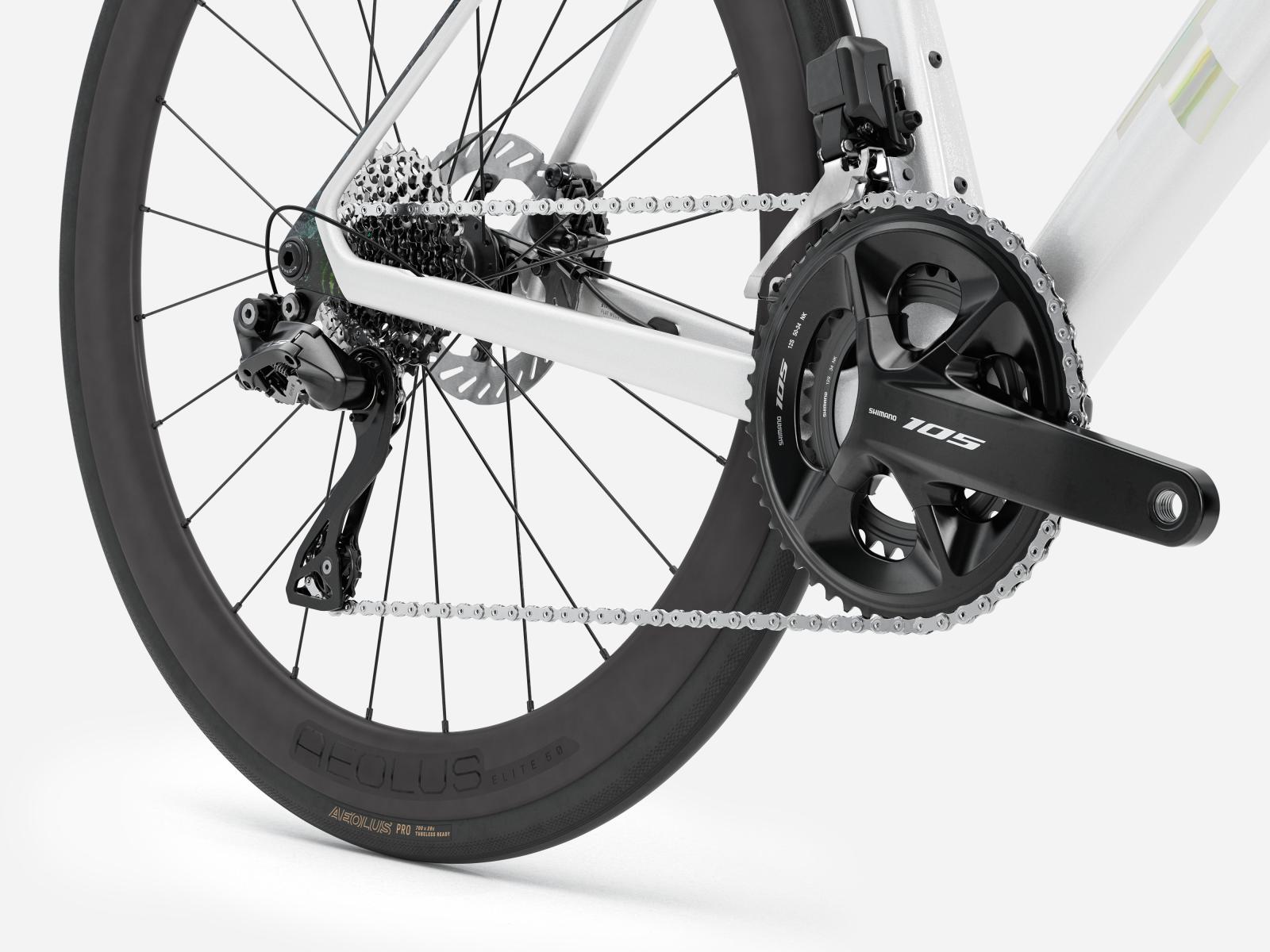 Das Madone SL 6 Gen 8 ist ein leichtes Aero-Rennrad, das seine SLR-Geschwister dank erschwinglicherem 500 Series OCLV Carbon preislich aussticht, ohne an Elite-Renntechnologien zu sparen. Die elektronische Shimano 105 Di2 Gruppe sorgt für blitzschnelle, drahtlose Gangwechsel, während etwa der solide Aluminiumlenker den Preis im Rahmen hält. Für eine superleichte Performance rollt das Bike auf schnittigen Carbonlaufrädern.