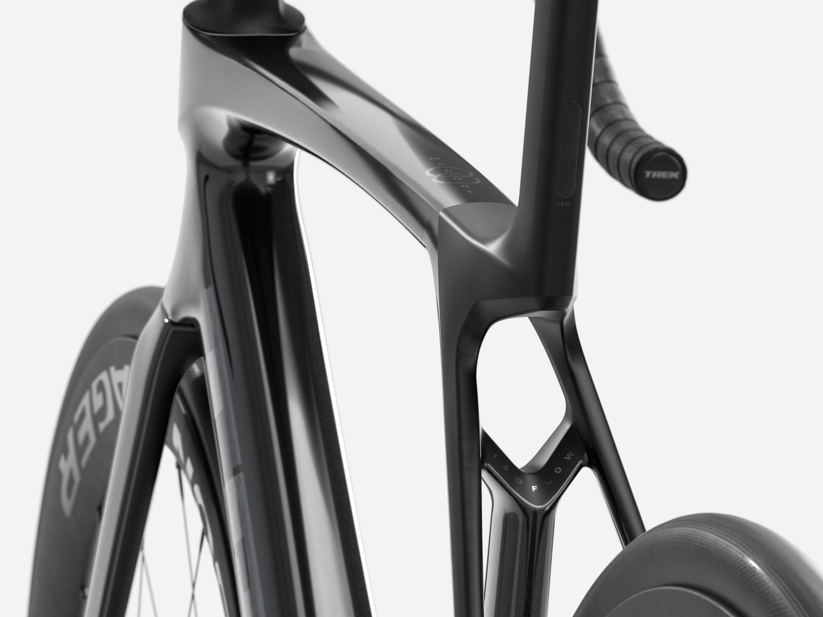 Gabel: Madone Gen 8, Vollcarbon, konischer Carbongabelschaft, interne Bremsleitungsführung, Flat Mount Scheibenbremsaufnahme, abgeschrägte 12 x 100 mm Steckachse