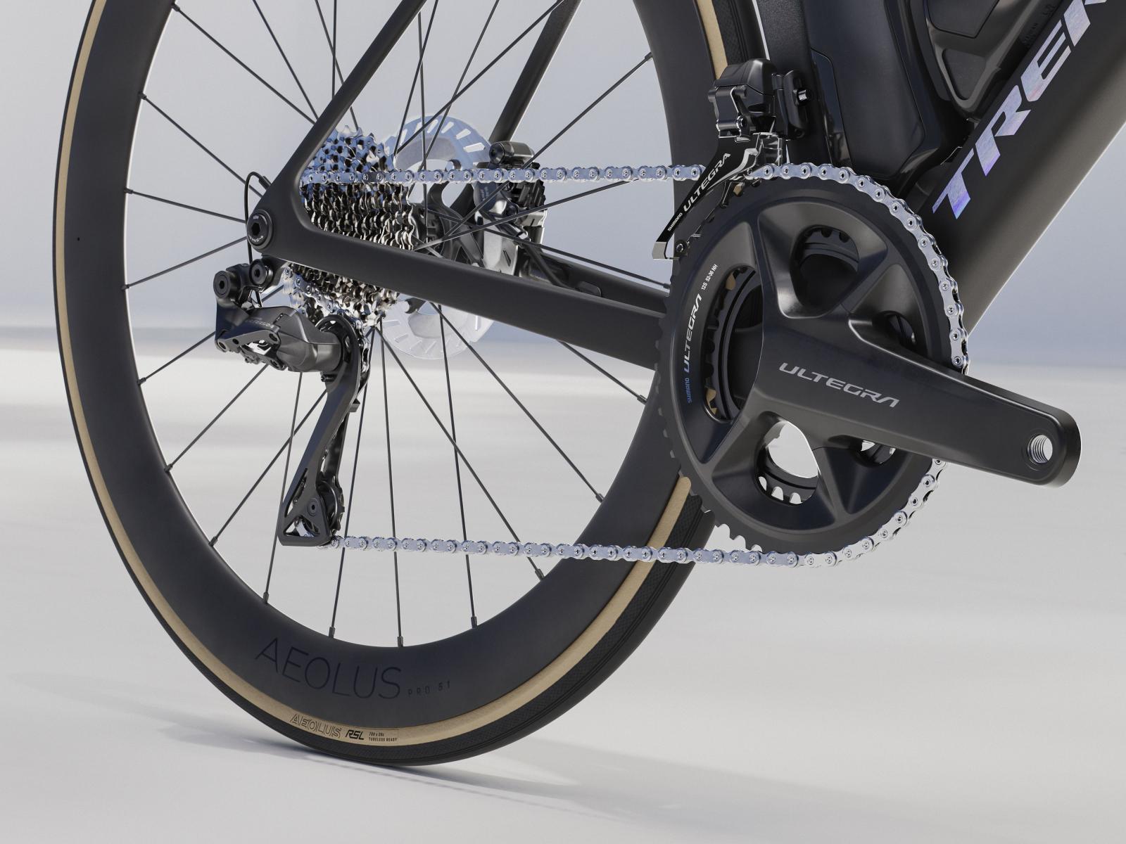 Einen unglaublich leichten, aerodynamisch optimierten Rahmen aus unserem besten 900 Series OCLV Carbon samt IsoFlow-Komforttechnologie und Watt-sparenden RSL Aero Trinkflaschen und Flaschenhaltern. Einen blitzschnell schaltenden Shimano Ultegra Di2 2x12-Antrieb, der sich individuell programmieren lässt, während das verbaute, weit verbreitete Universalschaltauge (UDH) die Ersatzteilbeschaffung erleichtert. Abgerundet wird die Ausstattung von schlauchlosen Bontrager Aeolus Pro 51 Carbonlaufrädern und einer einteiligen Trek Aero RSL Lenker/Vorbau-Einheit.