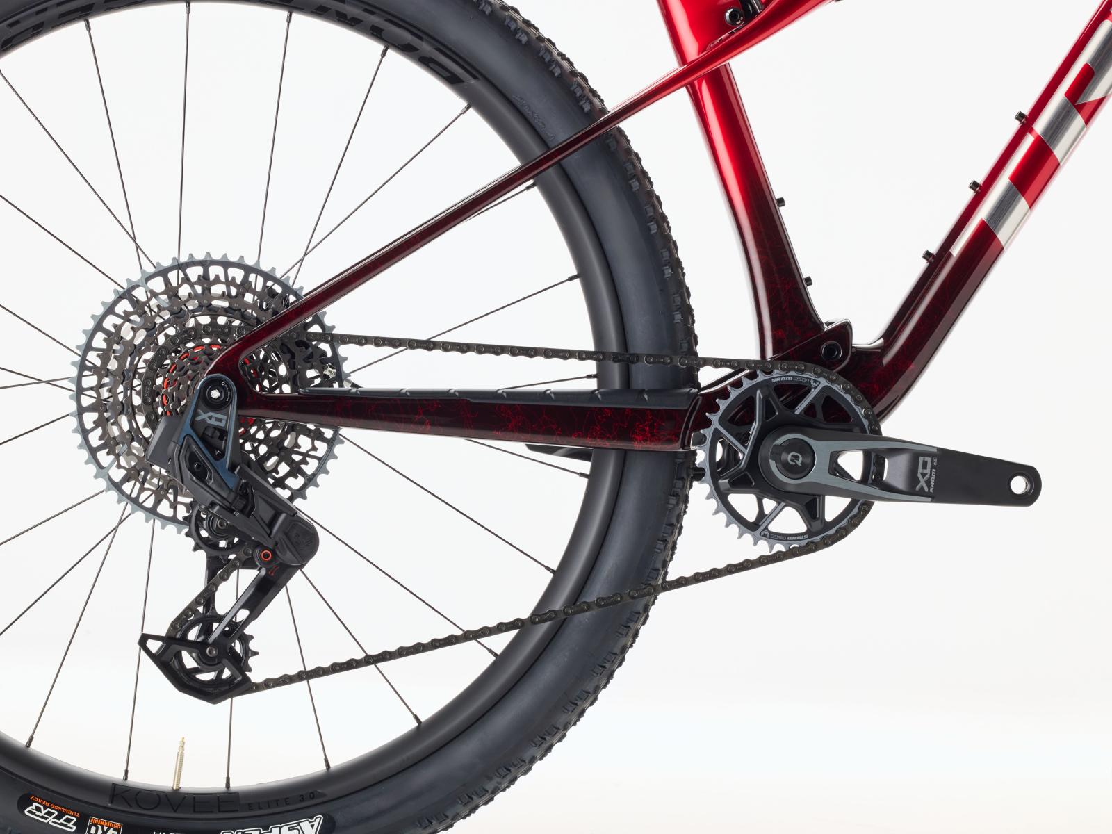 Einen federleichten Rahmen aus hochmoduligem SLR OCLV Mountain Carbon mit moderner XC-Geometrie. Außerdem bekommst du eine RockShox SID SL Ultimate 110-mm-Federgabel mit DebonAir Federung und Charger Race Day Dämpfung und einen RockShox SIDLuxe IsoStrut 80-mm-Hinterbaudämpfer – natürlich komplett mit Flight Attendant Technologie von RockShox. Eine ultraleichte, komplett drahtlose elektronische SRAM X0 AXS 12fach-Transmission, Bontrager Kovee RSL Carbonlaufräder, eine integrierte Bontrager RSL Lenker/Vorbau-Einheit aus Carbon, eine drahtlose RockShox Reverb AXS Variosattelstütze und hydraulische SRAM Motive Silver 4-Kolben-Scheib