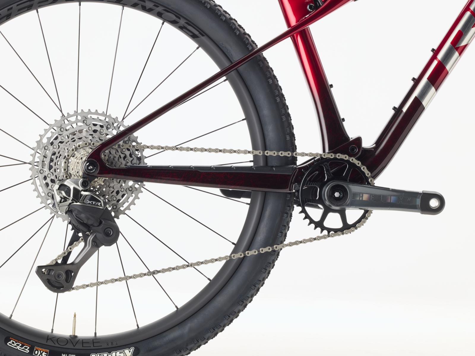Einen federleichten Rahmen aus High-Modulus SLR OCLV Mountain Carbon mit moderner XC-Geometrie. Zudem eine Fox Factory 34 SL Step-Cast 110-mm-Federgabel mit Float EVOL Luftfederung, GRIP SL 2-Positionen-Dämpfung und Dual Remote-Lockout sowie einen RockShox SIDLuxe IsoStrut-Dämpfer mit 80 mm Federweg. Ein brandneuer drahtloser Shimano XTR Di2 12fach-Antrieb, Bontrager Kovee RSL Carbonlaufräder, eine integrierte Bontrager RSL Lenker/Vorbau-Einheit aus Carbon, eine FOX Transfer SL Variosattelstütze und hydraulische Shimano XTR M9200 Scheibenbremsen runden das Ausstattungspaket ab.